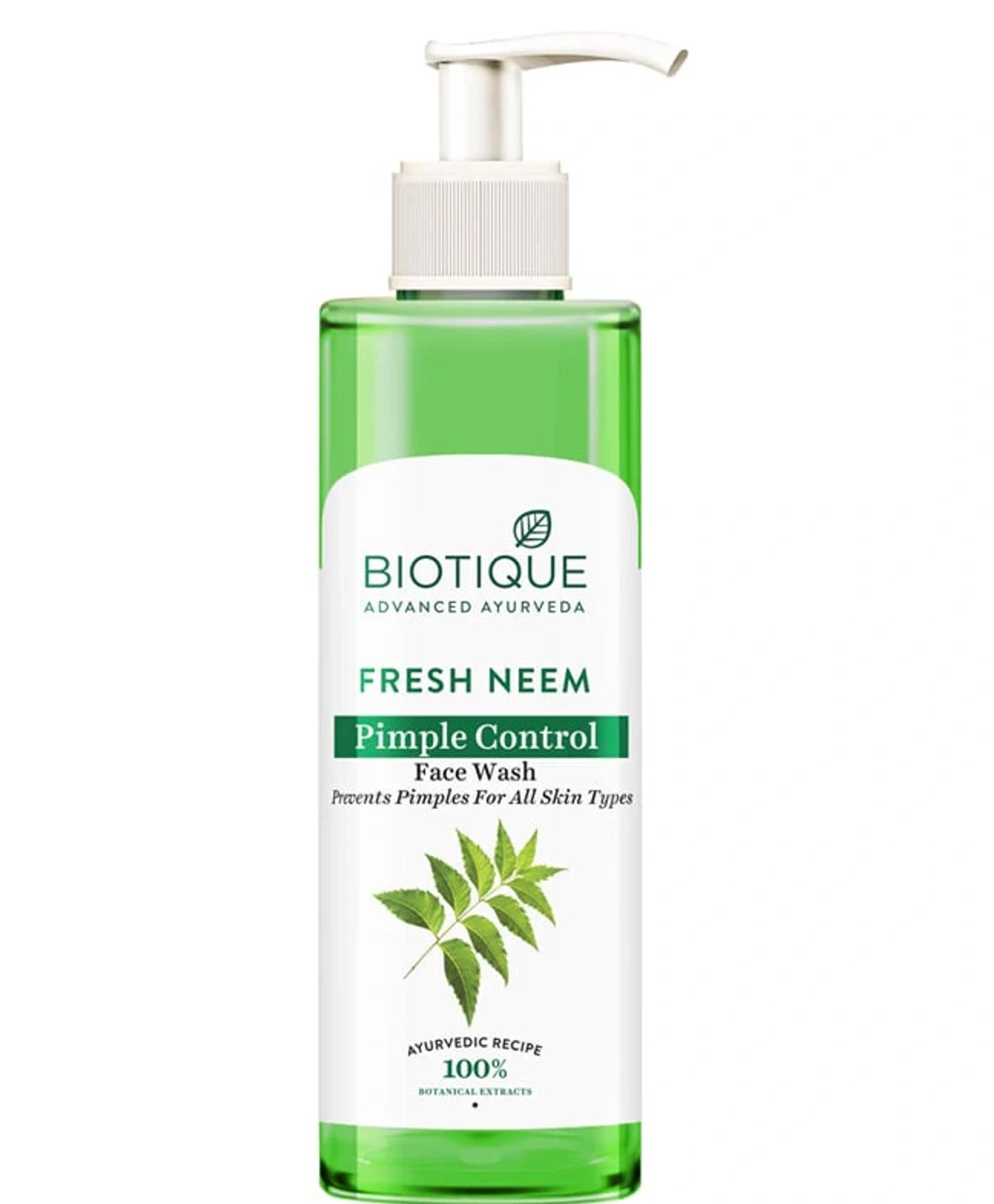 • The Biotique Fresh Neem Pimple Control Face Wash is a gentle and effective cleansing gel face wash that purifies the pores, removes makeup, prevents pimples, and keeps the acne at bay. This soap-free face wash is formulated with 100% natural botanical extracts, ensuring a safe and healthy skincare routine without harmful chemicals. With its antibacterial properties, our neem face wash keeps those pesky pimples at bay while being gentle on your skin. It washes away impurities, leaving your skin squeaky clean and clear. The natural ingredients in this face wash work harmoniously to clarify your pores, giving you naturally pimple-free skin. The Biotique face wash is enriched with the goodness of neem leaves, ashwagandha, and kulanjan. These key ingredients work together to remove impurities, purify your complexion, and promote clear, soft, and healthy skin. The Fresh Neem Face Wash is organically pure and dermatologically tested, making it suitable for all skin types. This face wash is recommended for regular use, allowing you to maintain a consistent skincare routine without any worries. Using the Biotique Fresh Neem Pimple Control Face Wash is a breeze. Apply it to a wet face and create a foamy lather. Rinse thoroughly and use daily to enjoy its full benefits.