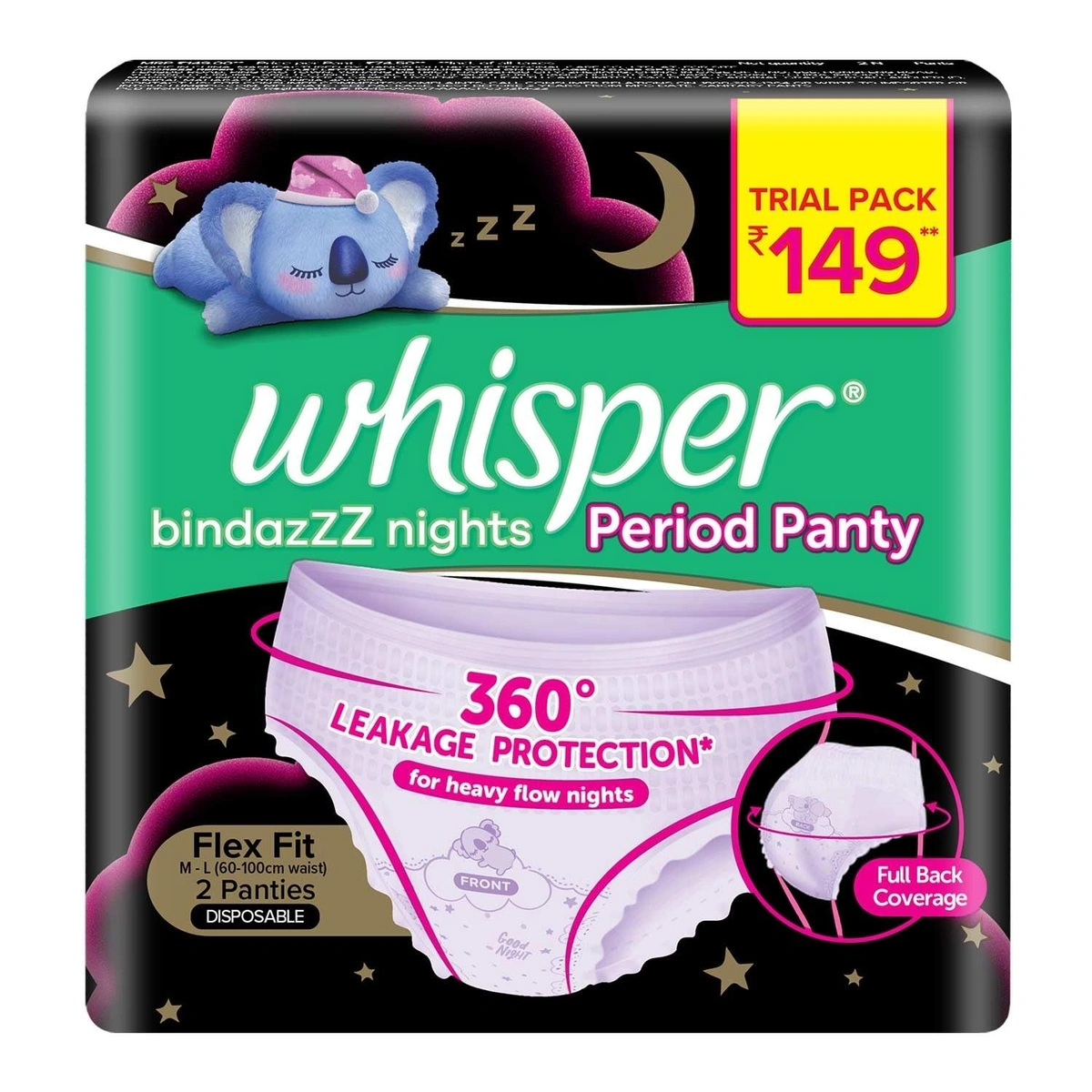 WHISPER BINDAZZZ NIGHTS PERIOD PANTY, 2 M-L PADS, 360 DEGREE LEAKAGE PROTECTION FOR HEAVY FLOW, UPTO 0% LEAKS, FULL BACK COVERAGE, PANTY LIKE FLEX FIT, SOFT & COMFORTABLE